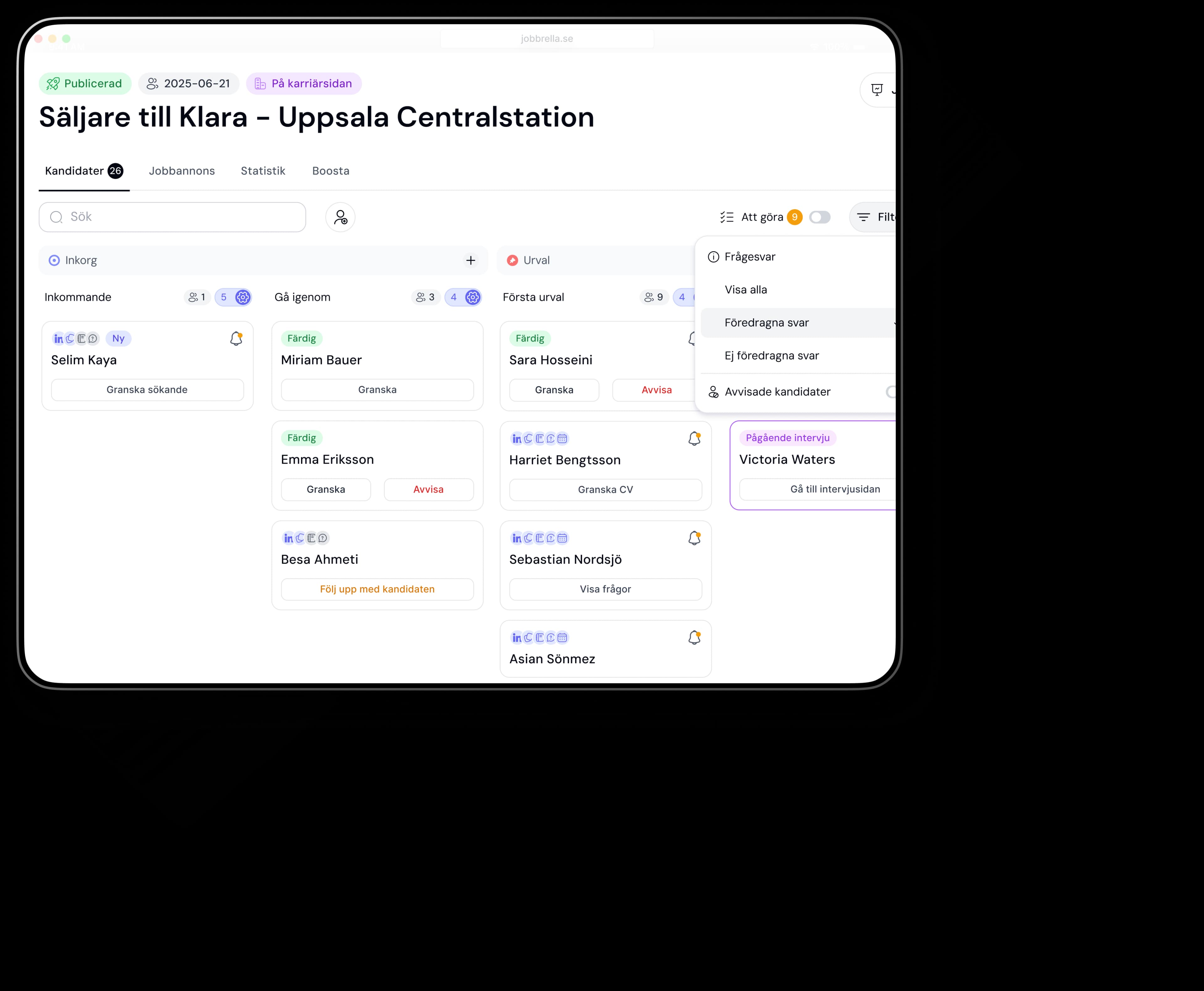 När ansökningarna kommer in hanterar du allt på ett ställe – från första kontakt till intervju och återkoppling.